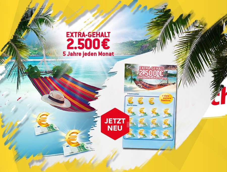 Ein neues Rubbellos in Nordrhein-Westfalen verspricht für 5 Euro die Chance auf einige Jahre finanzielle Unbesorgtheit: ein Extra-Gehalt von 2.500 Euro, 5 Jahre jeden Monat. Damit dürfte es sich ein halbes Jahrzehnt lang angenehm leben lassen, ganz unabhängig von beruflichen Stress.